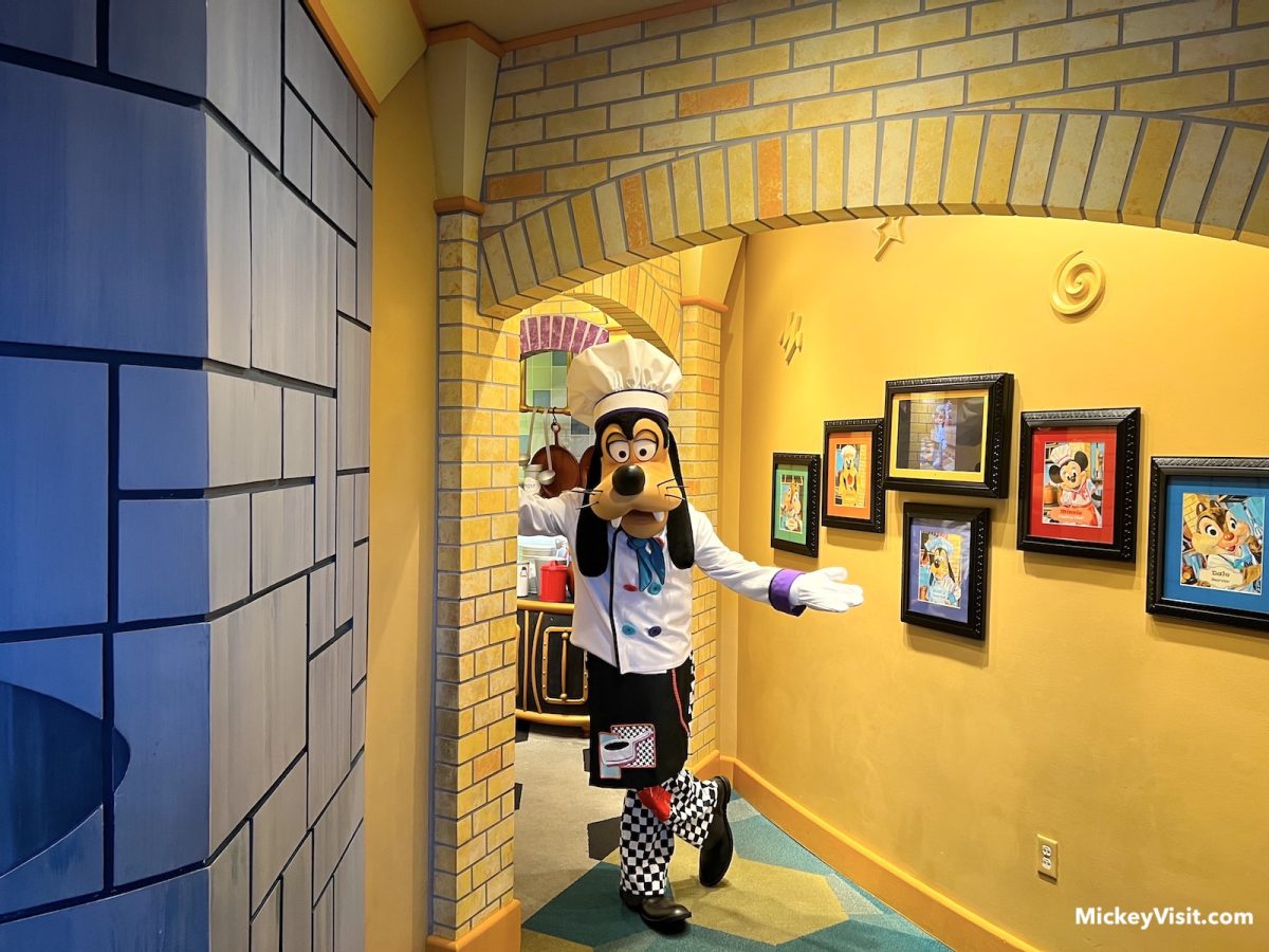 What characters are here? Goofy’s Kitchen is home to Goofy and a variety of other random characters. In the past, we have seen characters including Pluto, Baloo from the Jungle Book, Aladdin and Jasmine, Alice from Alice in Wonderland, Chip or Dale, and Pinocchio. In the evening, Minnie Mouse might be found here.