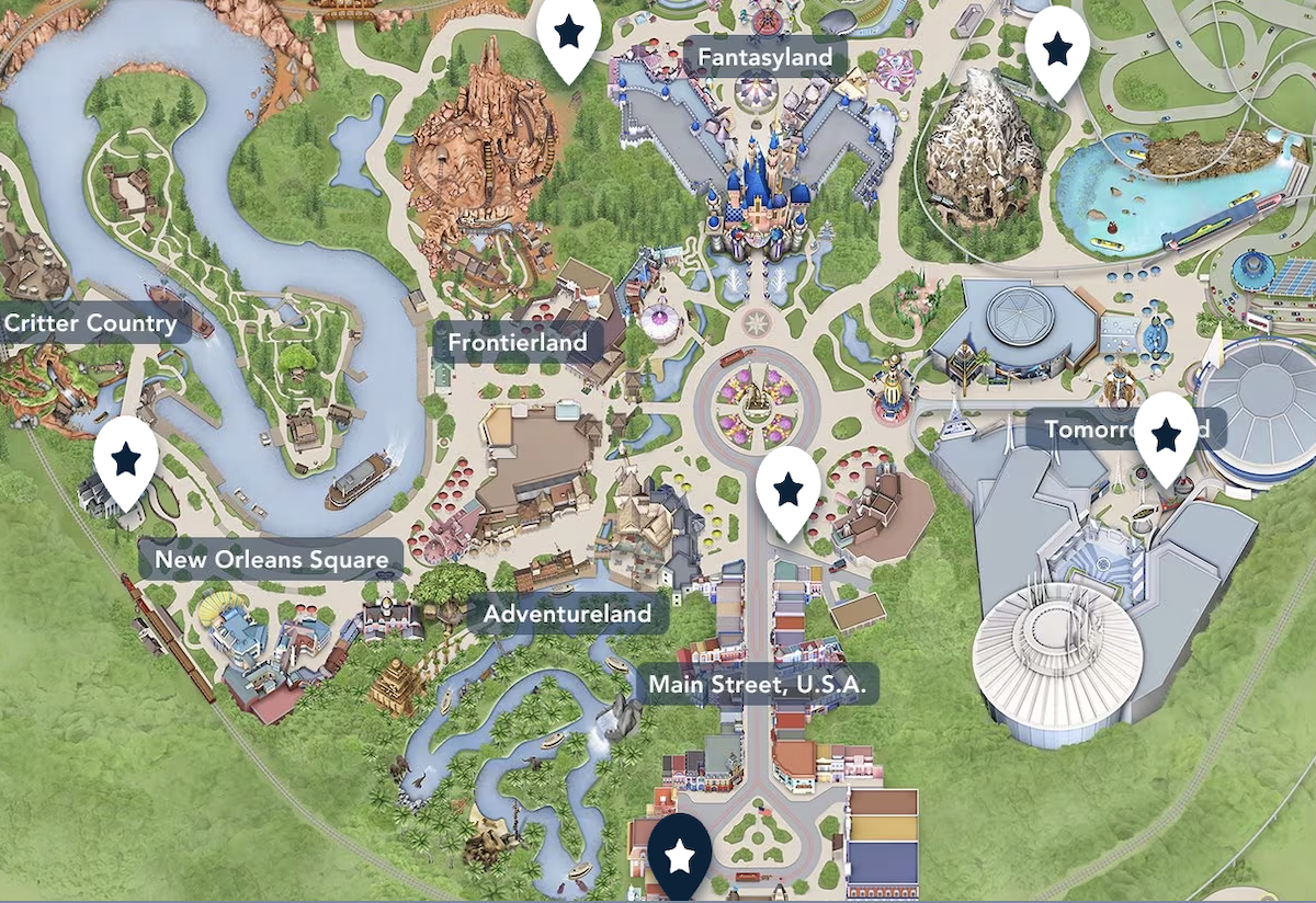 You can see a map of Disneyland Park below that marks its lands, main attractions, dining areas, and more below: