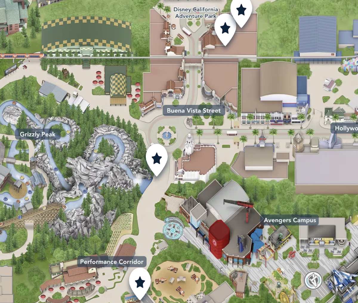 You can see a map of Disney California Adventure below that marks its lands, main attractions, dining areas, and more below: