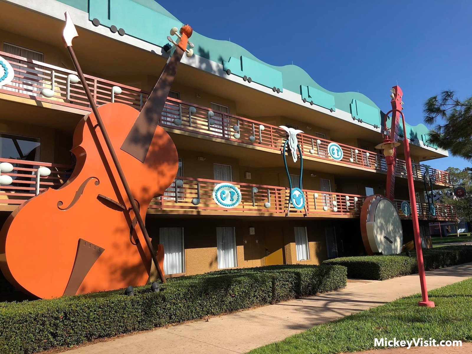 Disney's All-Star Music Resort is one of the three All-Star value resorts. Disney's All-Star Music Resort has fun music-inspired theming paying homage to various genres like country, jazz, rock ‘n’ roll, calypso, and Broadway-style show tunes. It has recreation like the guitar-shaped Calypso Pool, the keyboard-shaped Piano Pool, and an arcade as well as a food court, family suites with music decor, and more.